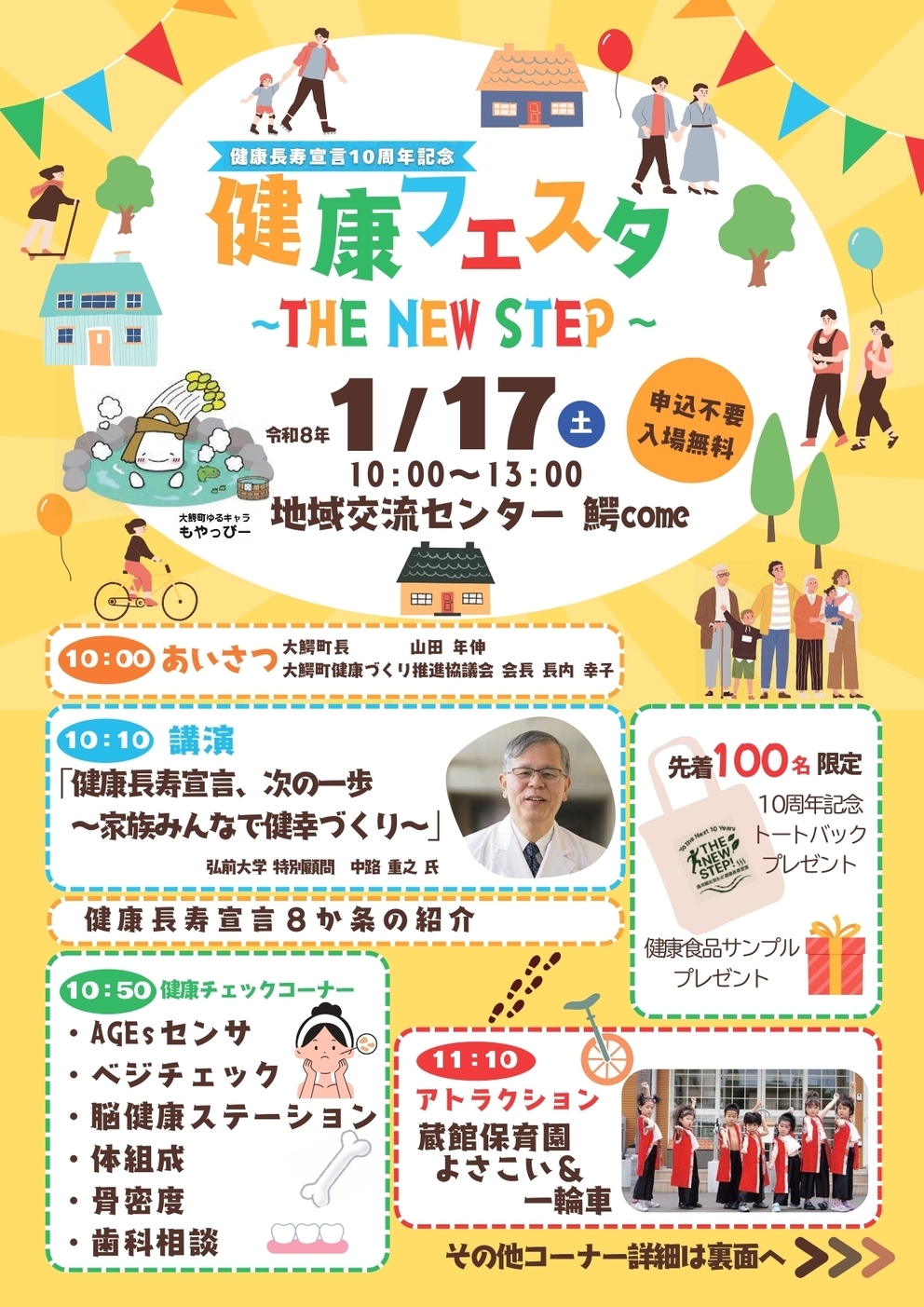 湯の郷おおわに健康長寿宣言10周年を記念して、健康フェスタを開催します。