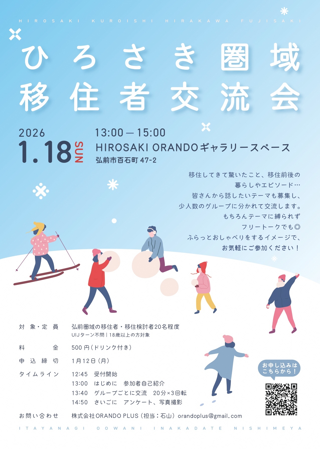 青森県外から弘前圏域市町村(弘前市、黒石市、平川市、藤崎町、板柳町、大鰐町、田舎館村、西目屋村)へ移住された方や移住を検討されている方が自由に交流できるイベントです。