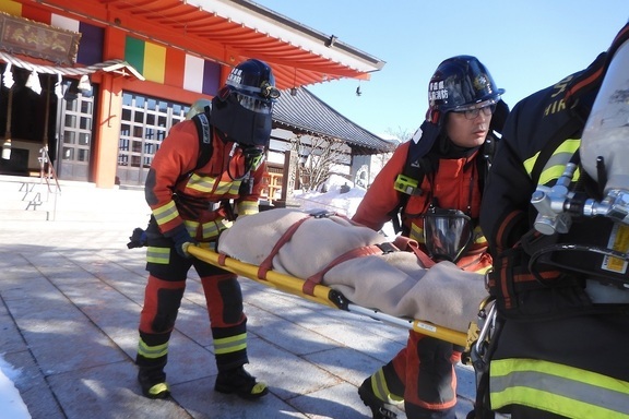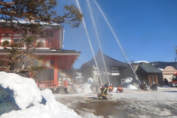 3.訓練内容:大日堂拝殿より火災が発生し、重要文化財である阿弥陀如来坐像への延焼危険を想定し訓練を行う。